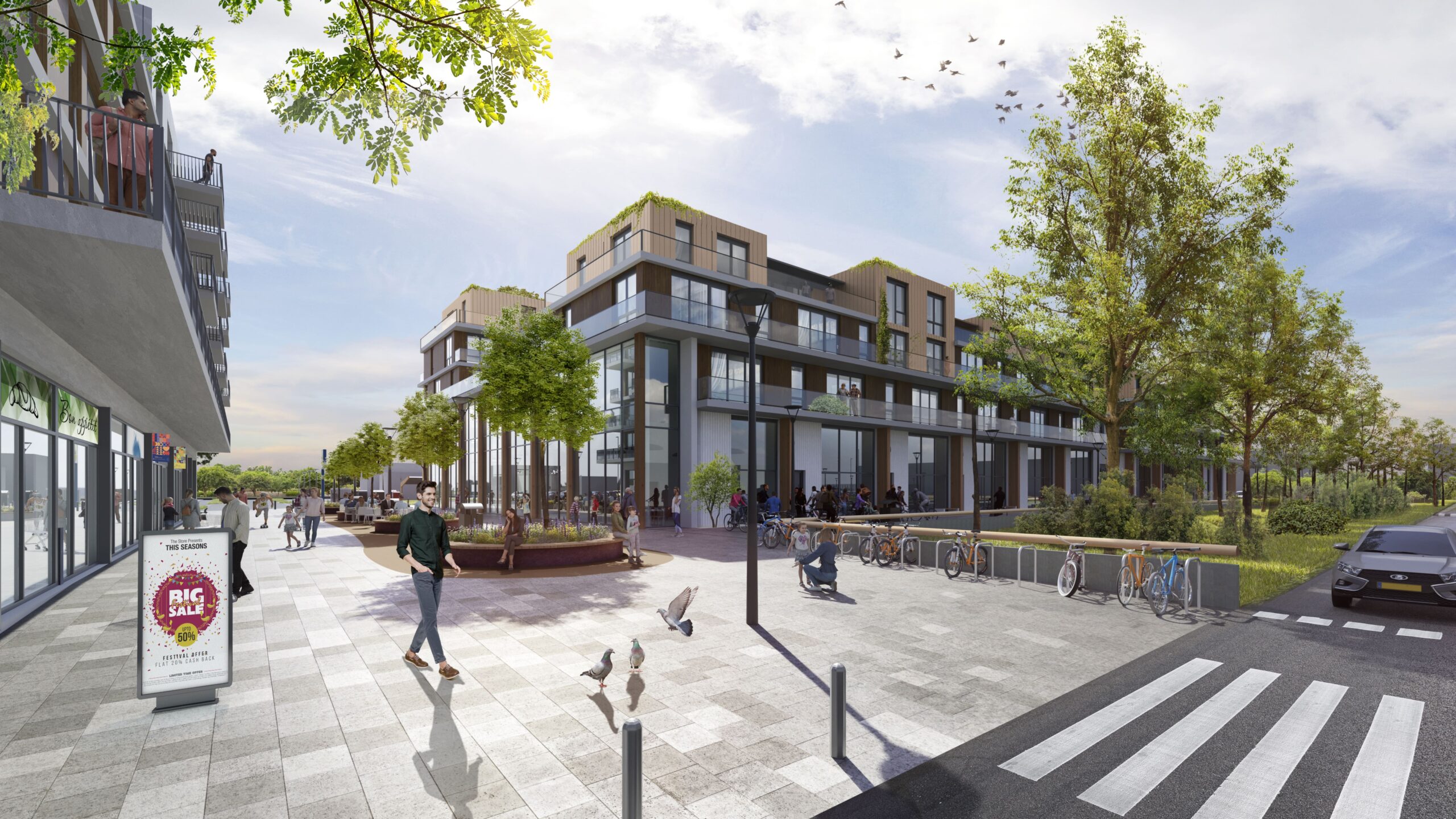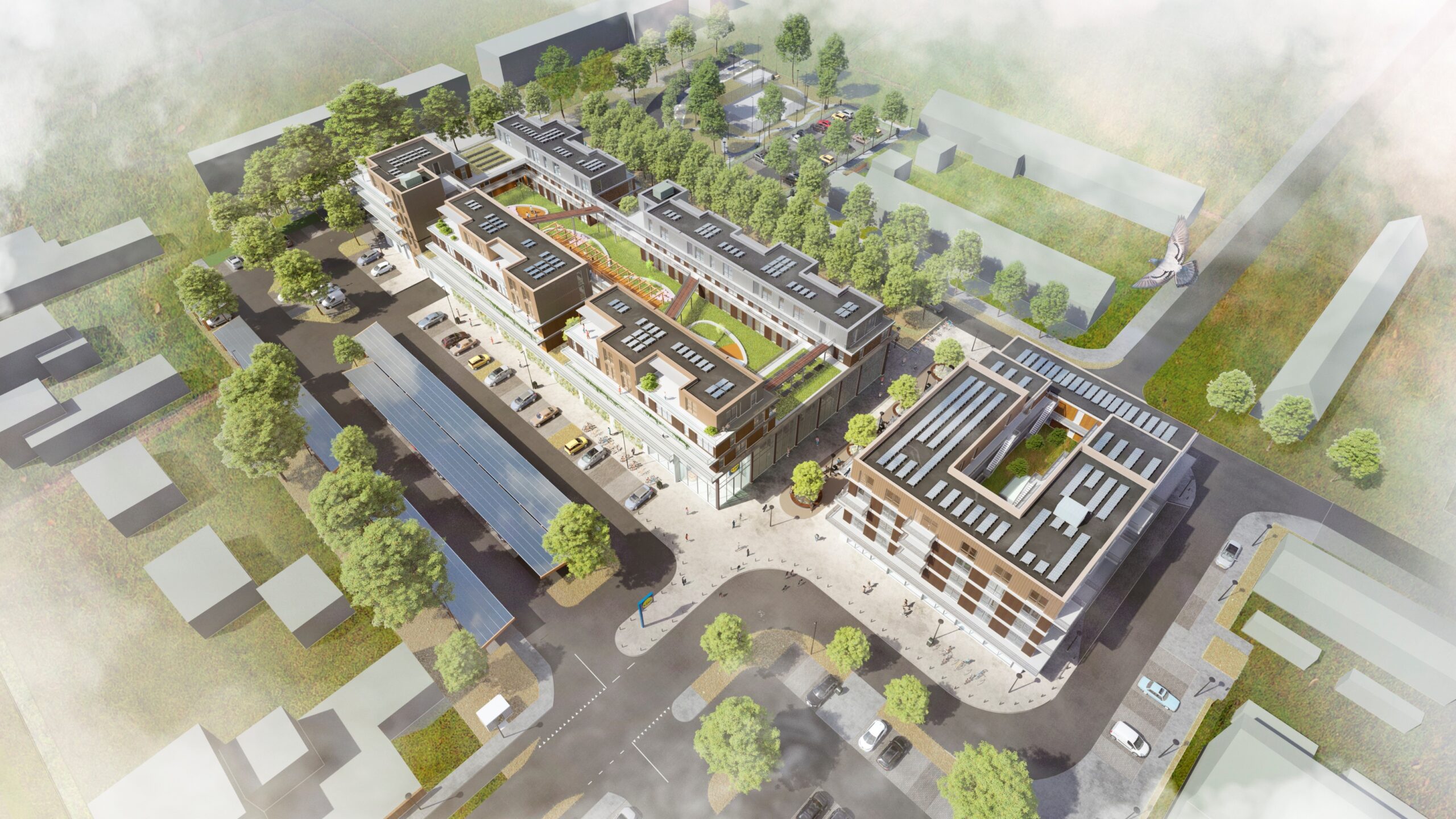 Naast de duurzame woningen kijken we ook naar andere mogelijkheden om een duurzaam winkelcentrum te realiseren. Zo wordt er straks maximaal gebruik gemaakt van zonne-energie door zonnepanelen te plaatsen op de daken van bebouwing en op de afdaken op de parkeerterreinen. Het regenwater wordt verzameld en zakt door infiltratie weg in de grond.
