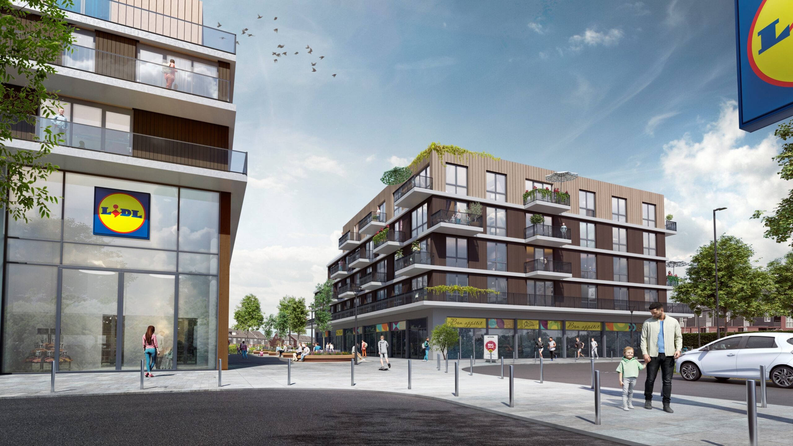 Het vele groen rond het nieuwe winkelcentrum zorgt voor een groen karakter. Maar we willen ook een duurzaam winkelcentrum dat klaar is voor de toekomst. Een moderne supermarkt zorgt dat er ook voor de andere winkels en de horeca voldoende publiek komt. Duurzaamheid is dus een van de belangrijkste thema’s in de plannen voor de nieuwbouw. Zo worden de appartementen gasloos en energiezuinig gerealiseerd.